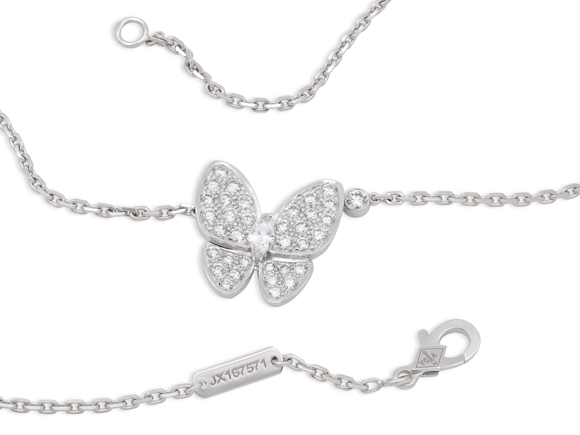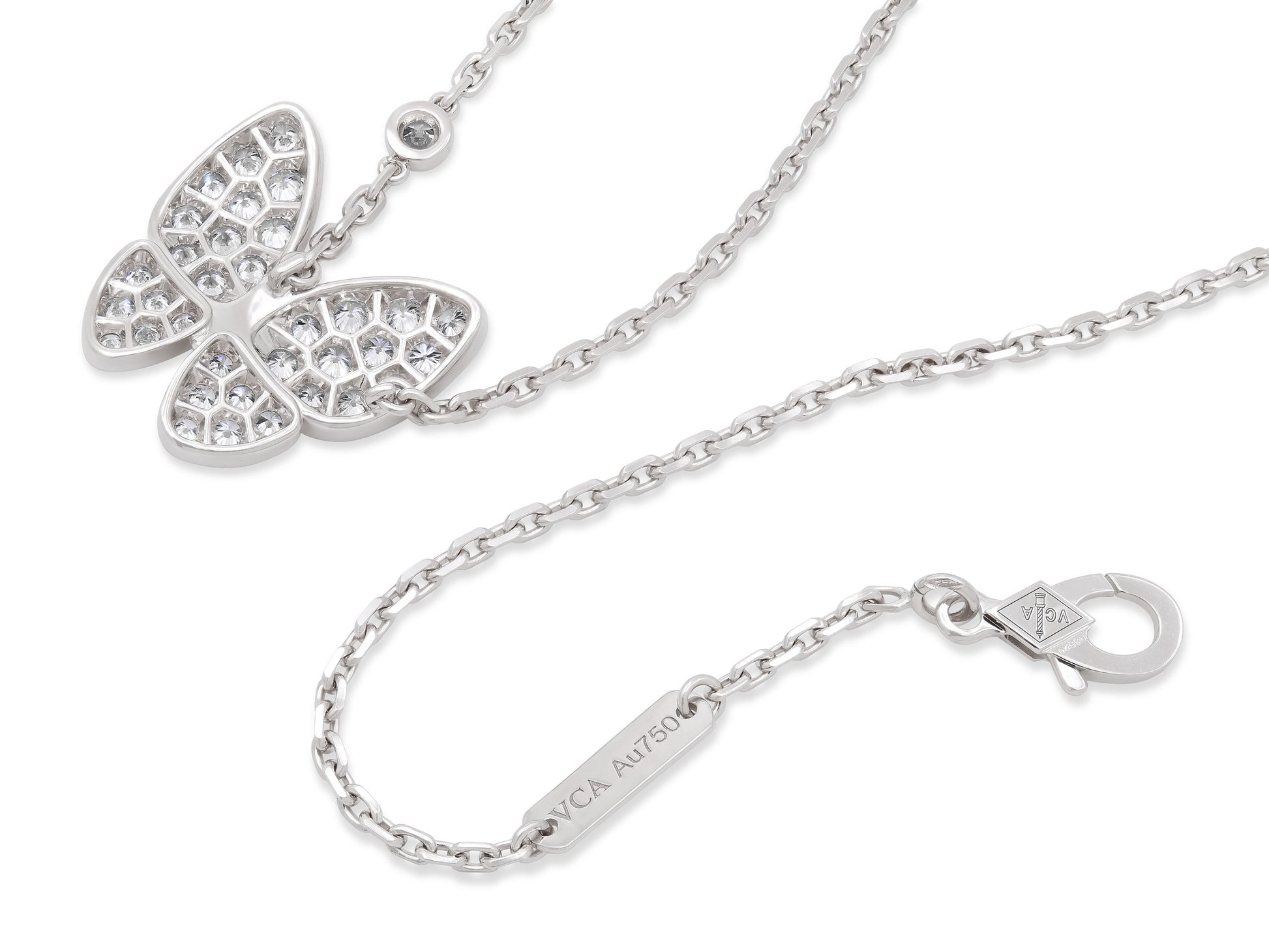 The butterfly pendant composed of a marquise-shape diamond body and diamond pavé wings, to the link chain accented with a bezel-set round brilliant diamond, in 18k white gold. Signed VCA for Van Cleef & Arpels. Includes manufacturer's box and paperwork.